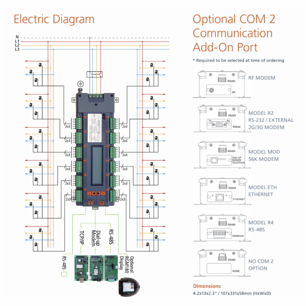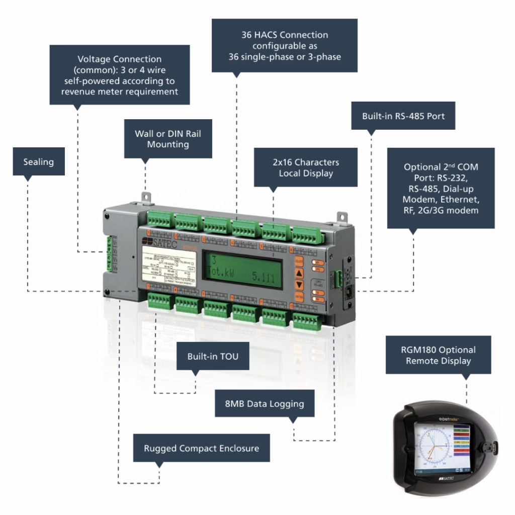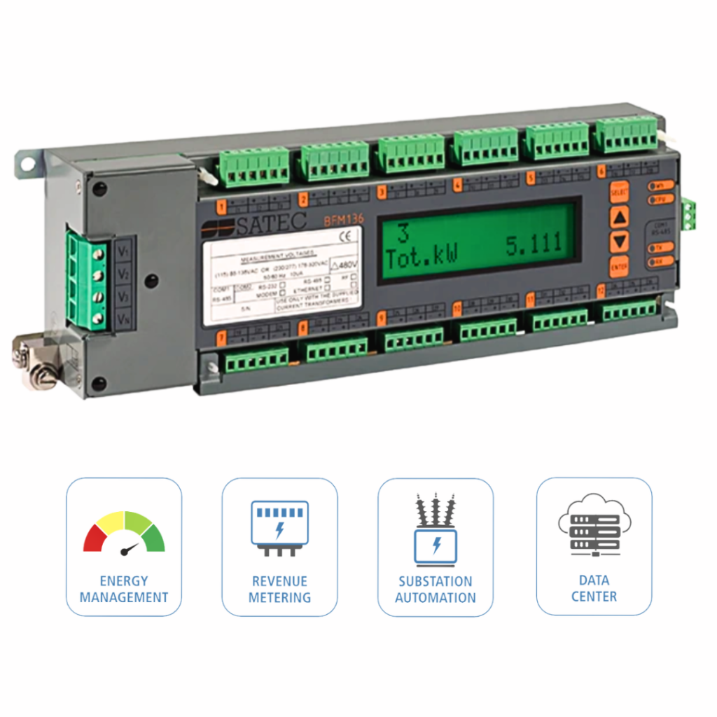 The BFM136 is intended for use within metering, energy management and monitoring systems where circuit-level visibility is required. Standard communication interfaces include RS-485 and Ethernet, with optional cellular connectivity for remote or distributed sites.